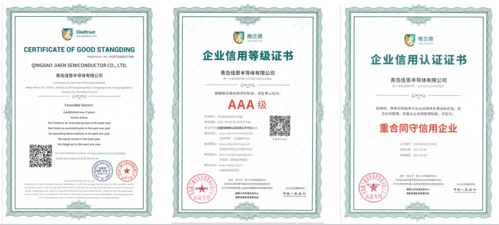 2020年3月,經(jīng)過中國招標(biāo)投標(biāo)網(wǎng)、中國招標(biāo)投標(biāo)公共服務(wù)平臺、中宏網(wǎng)、第三方信用認(rèn)證機(jī)構(gòu)格蘭德信用評價認(rèn)證中心的嚴(yán)格審核,青島佳恩半導(dǎo)體有限公司榮獲"AAA級企業(yè)信用等級"證書,這標(biāo)志著青島佳恩半導(dǎo)體有限公司在規(guī)范運營、誠信經(jīng)營上得到了國家相關(guān)部門及權(quán)威機(jī)構(gòu)的認(rèn)可。